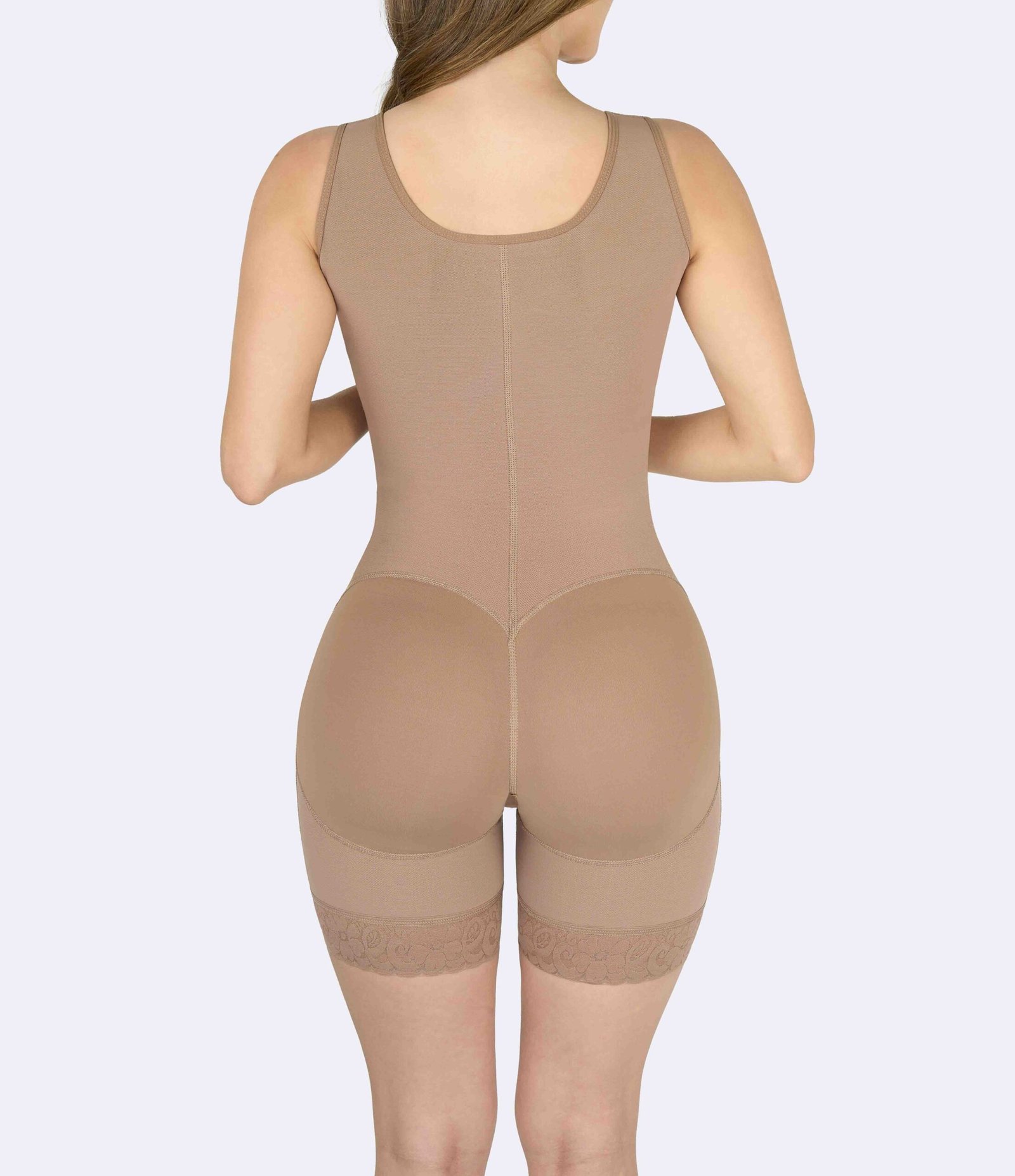 Full coverage shapers that offer firm compression and support for abdomen, bust, hips, and thighs, improving posture and enhancing curves.